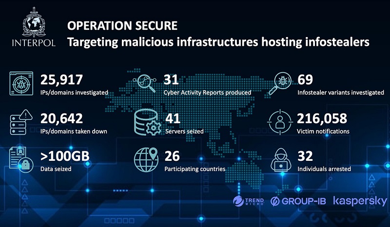Singapur.- Más de 20.000 direcciones IP o dominios maliciosos vinculados a ladrones de información fueron desmantelados en una operación coordinada por la Organización Internacional de Policía Criminal (INTERPOL) contra la infraestructura cibercriminal.
