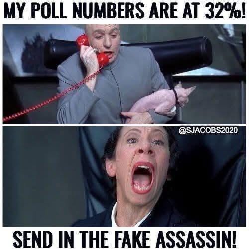 El meme lo dice todo: «My poll numbers are at 32%!, Send in the fake assassin! ¡Mis resultados en las encuestas son del 32%! ¡Que venga el falso asesino! Y la imagen que acompaña al texto pone al Dr. Evil, y su ayudante-amante Frau Farbissinain, ambos enemigos del personaje principal de la serie de filmes Austin Powers.