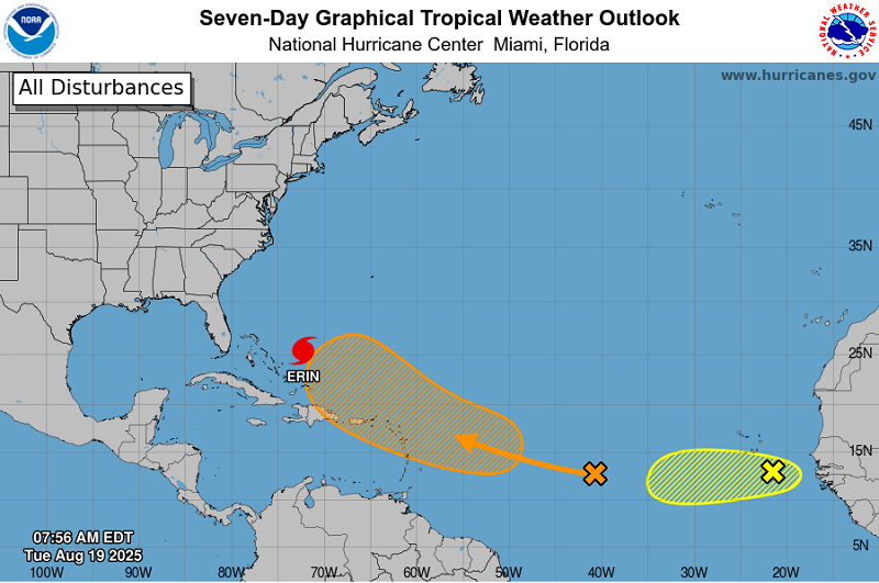 Miami.- El Centro Nacional de Huracanes de Estados Unidos (NHC, siglas en inglés) está emitiendo advertencias sobre el huracán Erin, ubicado a un par de cientos de millas al noreste del sureste de las Bahamas.