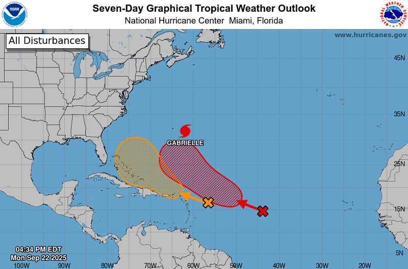 Miami.- El Centro Nacional de Huracanes de Estados Unidos (NHC, siglas en inglés) que ha emitido advertencias sobre el huracán Gabrielle, ubicado sobre el Atlántico subtropical central, informó que a las 5:00 de la tarde el ojo del ciclón se localizó cerca de la latitud 31.7 Norte, longitud 61.8 Oeste y se está moviendo hacia el nor-noreste cerca de 12 mph (19 km/h).