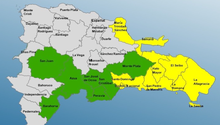 En alerta amarilla están Santo Domingo, María Trinidad Sánchez, San Pedro de Macorís, La Altagracia, El Seibo, Distrito Nacional, La Romana, Samaná y Hato Mayor.