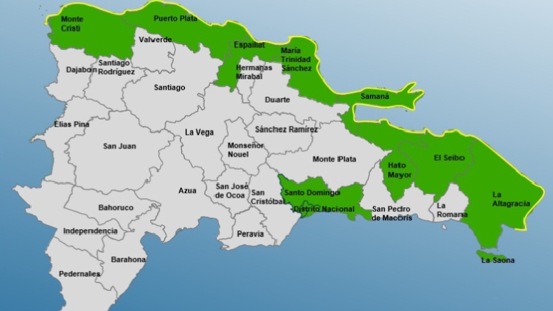 La alerta abarca Santo Domingo, el Distrito Nacional, La Altagracia, Hato Mayor, Espaillat, Montecristi, El Seibo, Samaná, María Trinidad Sánchez y Puerto Plata.