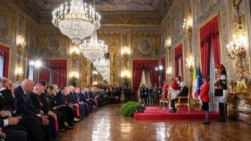En el Salón de los Espejos, tras escuchar el discurso del Presidente de la República Italiana, Sergio Mattarella, el Papa agradece «el compromiso del Gobierno italiano en favor de tantas situaciones de dificultad relacionadas con la guerra y la miseria, en particular con respecto a los niños de Gaza, también en colaboración con el Hospital Bambino Gesù». Se trata, explica, de «contribuciones importantes y eficaces para la construcción de una convivencia digna, pacífica y próspera para todos los miembros de la familia humana».