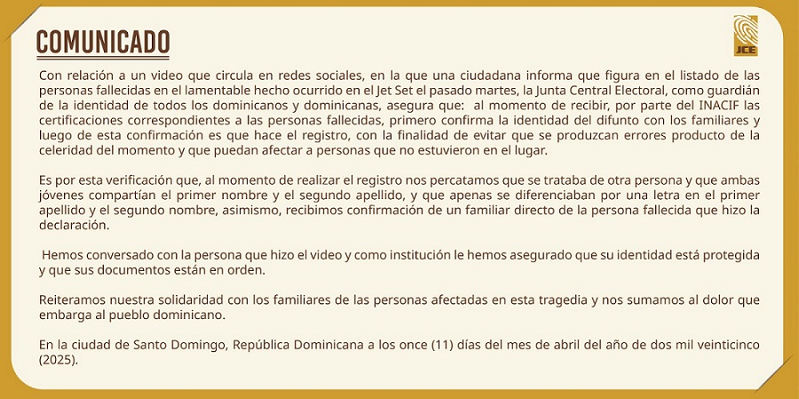 En un comunicado de prensa, la JCE dijo que “es por esta verificación que, al momento de realizar el registro nos percatamos que se trataba de otra persona y que ambas jóvenes compartían el primer nombre y el segundo apellido, y que apenas se diferenciaban por una letra en el primer apellido y el segundo nombre, asimismo, recibimos confirmación de un familiar directo de la persona fallecida que hizo la declaración”.
