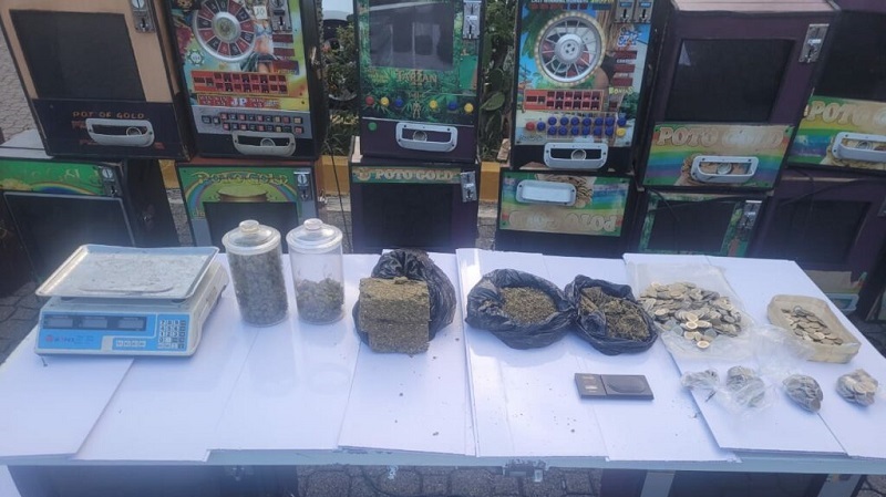 En el lugar fueron ocupadas como evidencia un aproximado de 3.6 libras de presunta marihuana, dos porciones de presumible cocaína, 19 máquinas tragamonedas, una balanza, y un peso digital.