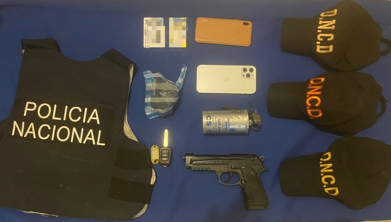 Durante la intervención, los agentes les ocuparon un chaleco antibalas de la Policía Nacional, tres gorras con insignias de la Dirección Nacional de Control de Drogas (DNCD), una bomba lacrimógena, una pistola marca Mackco sin documentos legales, y varias porciones de una sustancia vegetal, presumiblemente marihuana.