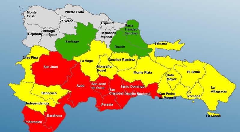 En alerta amarilla están La Vega, La Romana, Hato Mayor, El Seibo, Samaná, San Pedro de Macorís, Monseñor Nouel, Sánchez Ramírez, La Altagracia, Elías Piña, Monte Plata, Independencia y Bahoruco, mientras que en verde figuran María Trinidad Sánchez, Santiago y Duarte.
