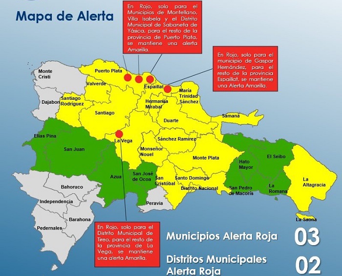 Mientras, en alerta amarilla se encuentran: Duarte( en especial el Bajo Yuna), Monseñor Nouel, Santiago, Samaná, La Altagracia, Valverde, San Cristóbal, Santo Domingo, María Trinidad Sánchez, Hermanas Mirabal, Distrito Nacional, Monte Plata, Santiago Rodríguez y Sánchez Ramírez.
