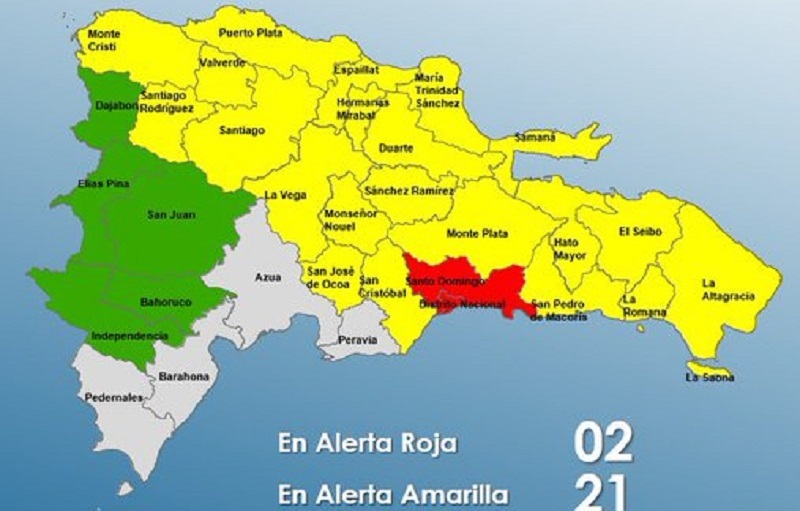 Mientras, en Amarilla se están: Puerto Plata, Monseñor Nouel, San José de Ocoa, Santiago Rodríguez, Espaillat, Sánchez Ramírez, San Cristóbal, Hato Mayor, María Trinidad Sánchez, Monte Plata, Santo Domingo, El Seibo, Valverde, La Vega, el Distrito Nacional, Hermanas Mirabal, Santiago, Montecristi, Duarte (en especial el Bajo Yuna), Samaná, San Pedro de Macorís, La Altagracia y La Romana.